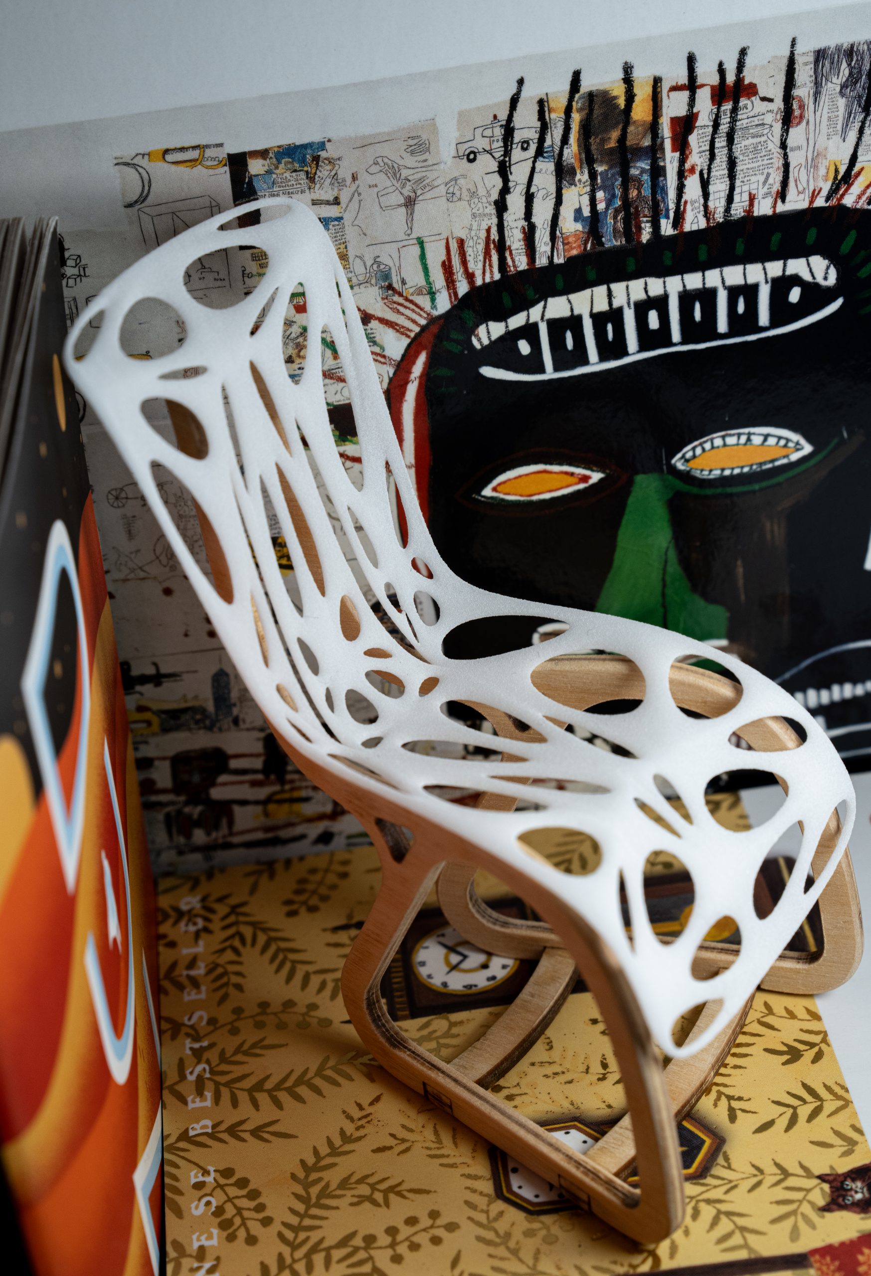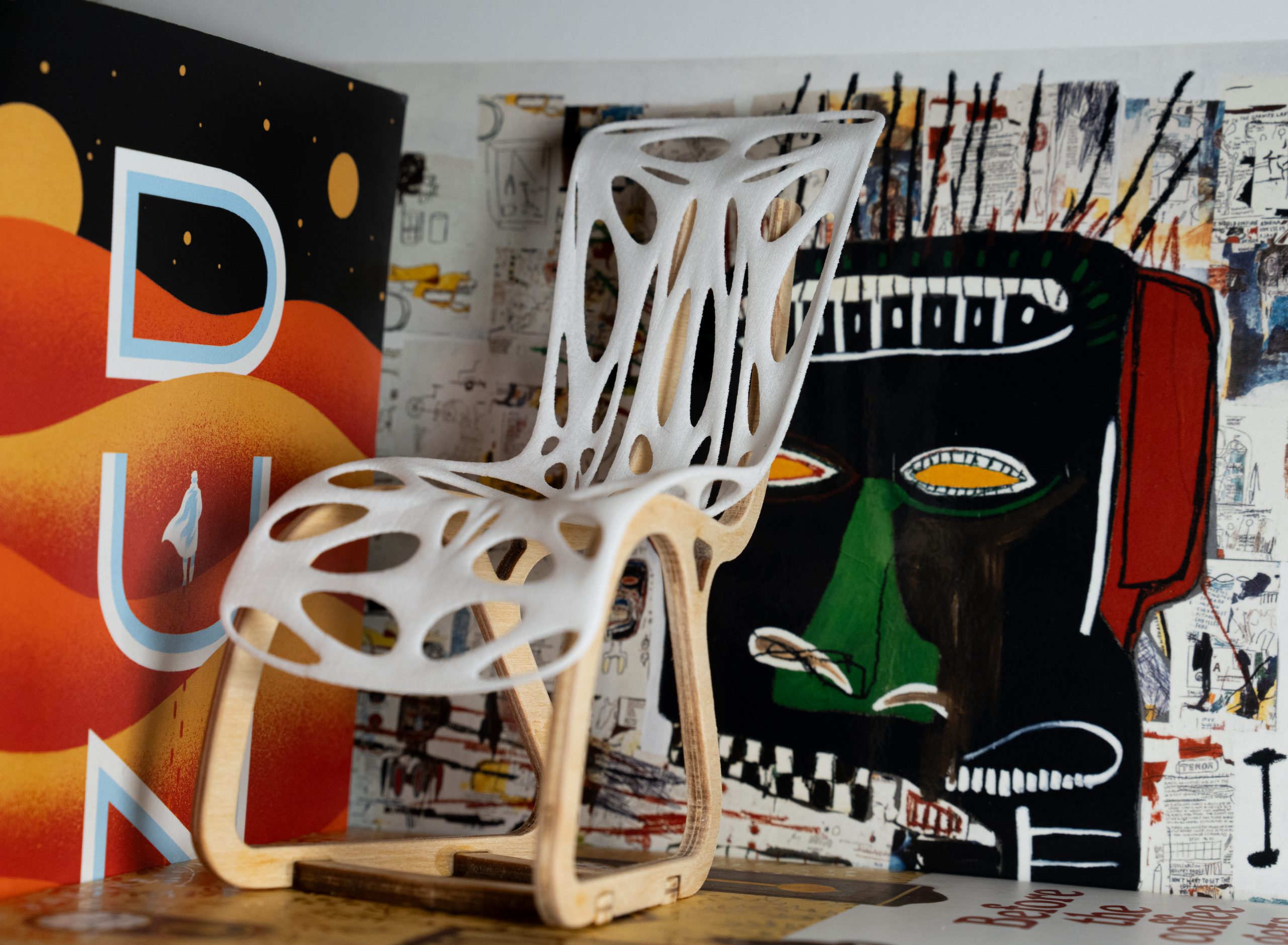 The second stage of the project saw the development of our end concept into a realistic product. My chair concept was largely focused on the selective distribution of material in the form of the chair to the regions that were most necessary for structural support and comfort. I’ve been fascinated for a while with the work of Charles and Ray Eames and took inspiration in their “low shell chair” from the 60s. I saw their leveraging of emerging technology (composite manufacturing), for a clean, nearly weightless form as a distillation of what I hoped to learn. I brought that philosophy into this project and leveraged emerging procedural techniques to realize my chair’s eventual form. I designed the base of my chair to contrast its digital counterpart in its assembly and planar nature. The base was constructed of thin ply, with the intent that the full-size version would be made of sections of cedar. The digital component of my chair was SLS printed, with the full-size version being either large format FDM printed, or constructed of chop strand fibreglass.
